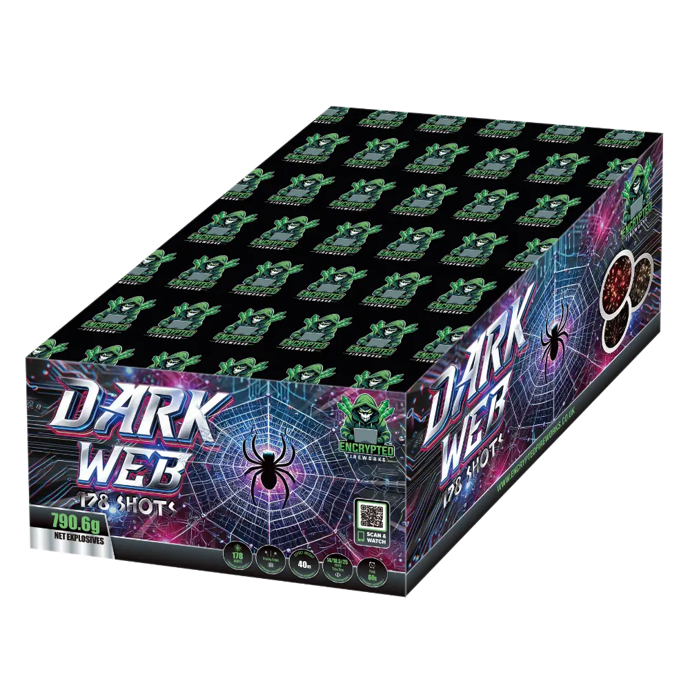 Dark Web is classified as F3 and is intended for outdoor use only in suitable open areas. Always follow UK fireworks safety guidance before use.