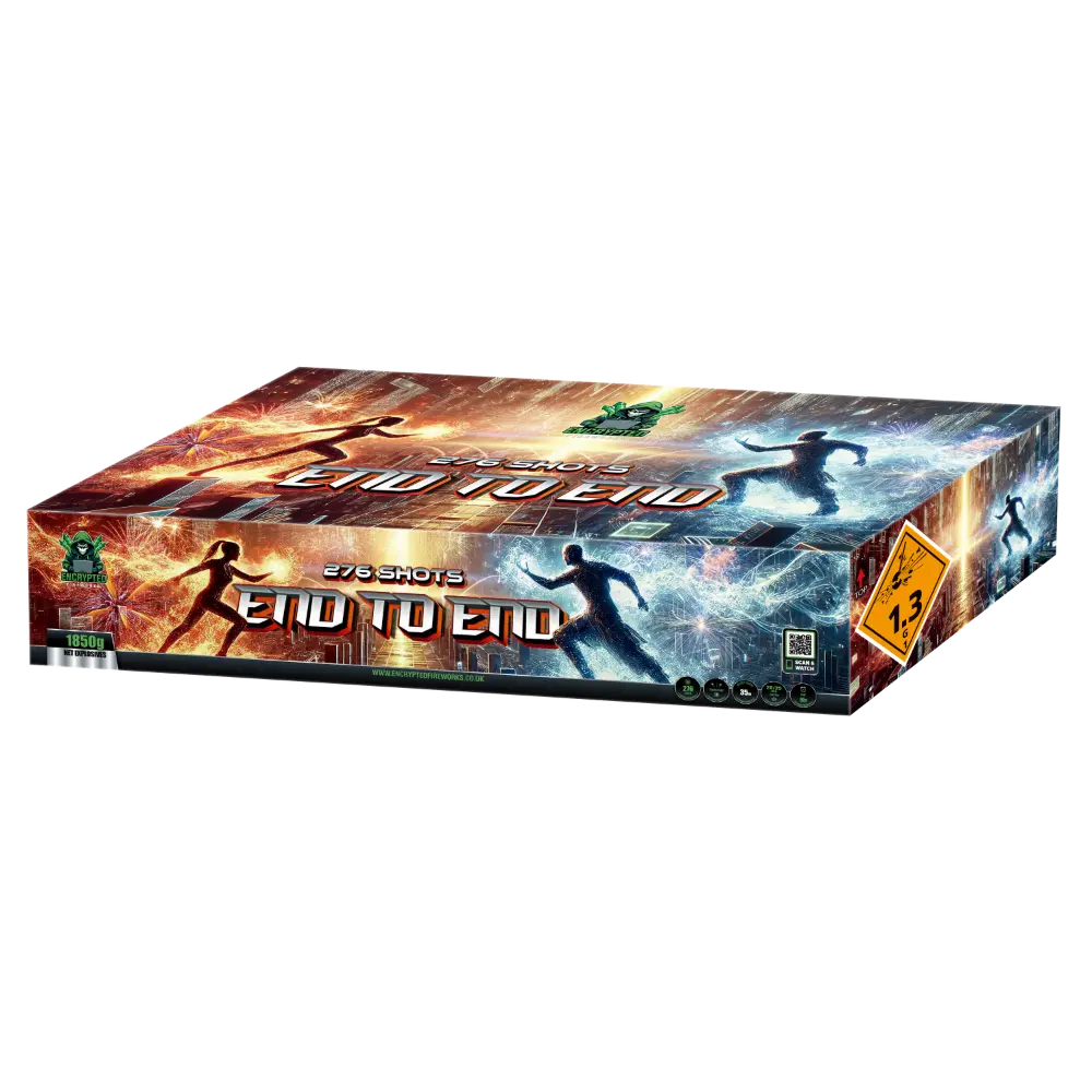 Safety is fundamental to how we design every product. End To End is classified as 1.3G and is intended for outdoor use only in suitable open areas. Always follow UK fireworks safety guidance before use.