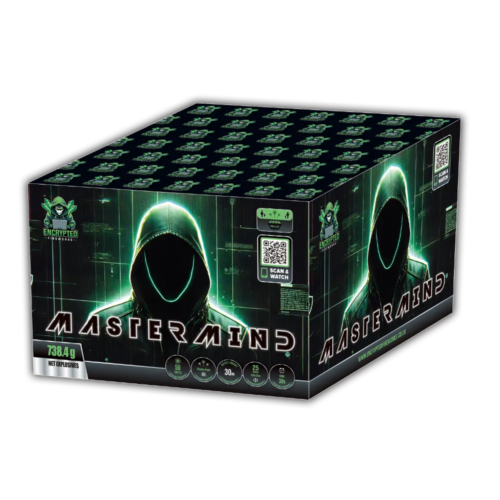 Mastermind delivers concentrated aerial impact with clean vertical projection, making it a dependable high-performance cake within the Encrypted Fireworks 2026 collection.