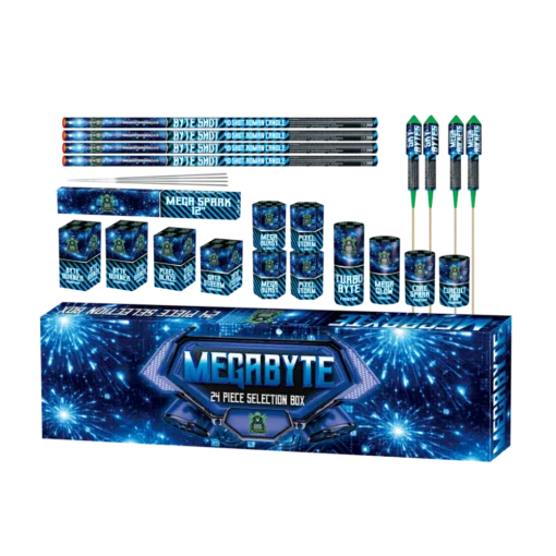 Product Summary: Megabyte is a 24 piece F2 mixed firework assortment featuring small cakes, fountains, rockets, roman candles, and sparklers. Built to provide both ground effects and aerial excitement, it offers a balanced display format suitable for family events, garden use, and trade distribution.