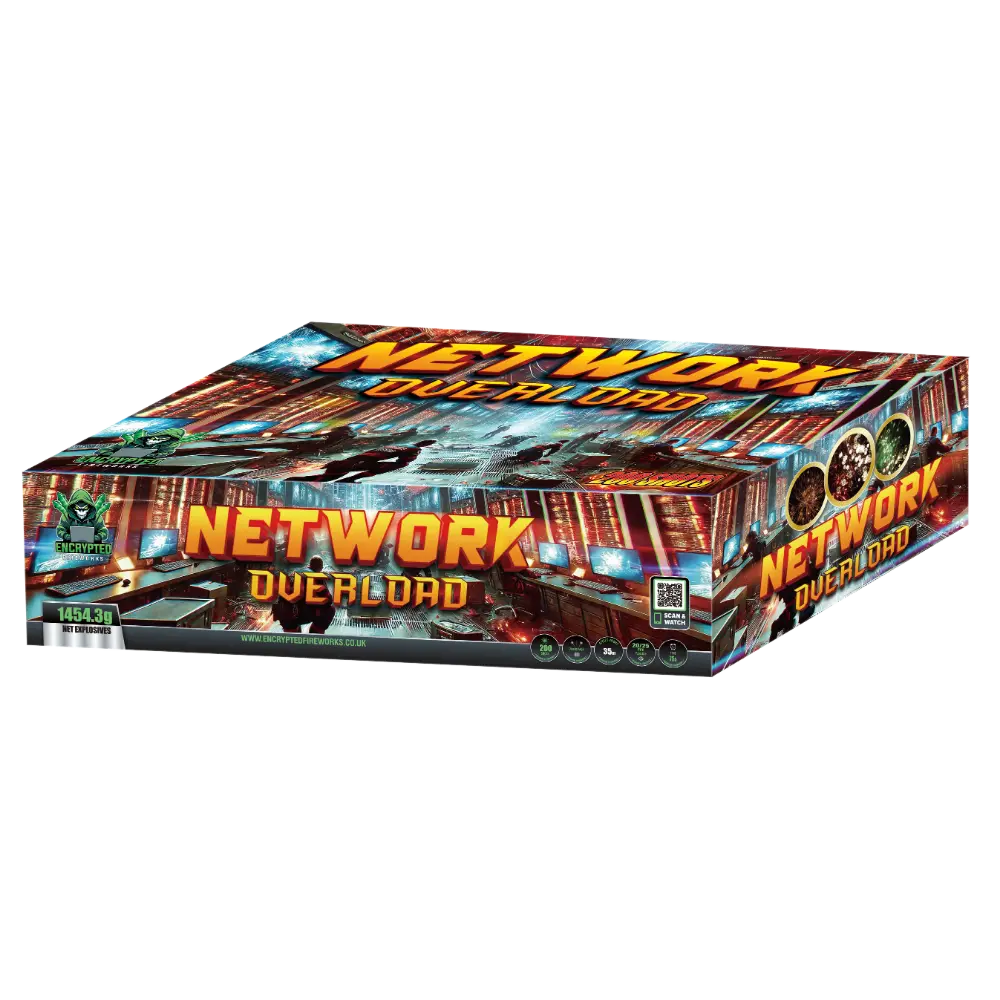 Network Overload is our 200 shot compound cake, developed as part of the Encrypted Fireworks 2026 collection. Built around layered calibre progression and mixed firing sequences, this compound delivers sustained sky coverage with a powerful visual presence from start to finish.