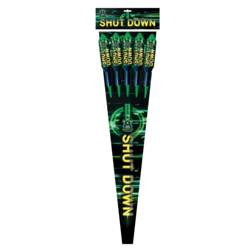 Shut Down rockets are classified F3 and are intended for outdoor use only in suitable open areas. Always follow the safety instructions supplied with the product. Use appropriate launch tubes or racks, maintain safe spectator distances, and never attempt to relight a misfire.