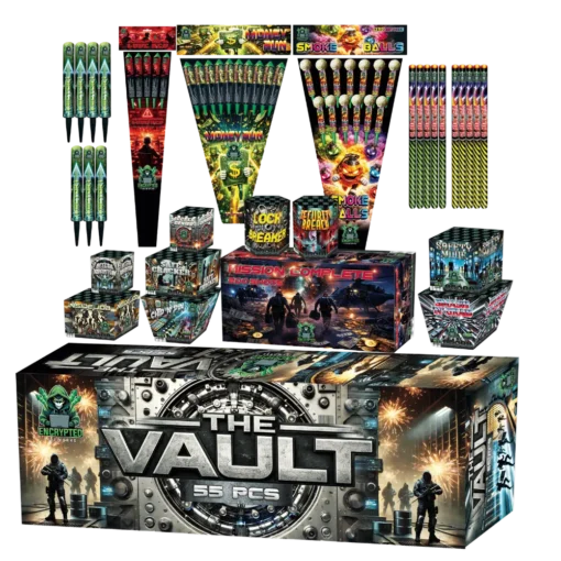 The Vault contains fireworks classified 1.3G and is intended for outdoor use only in suitable open areas. Always follow the safety instructions supplied with each item. Ensure fireworks are placed on stable surfaces, maintain safe spectator distances, and never attempt to relight a misfire.